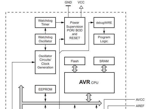 Below is a block diagram of the hugely popular Microchip ATmega328P microcontroller (as used by Arduino) showing Flash, SRAM and EEPROM in the chip architecture: